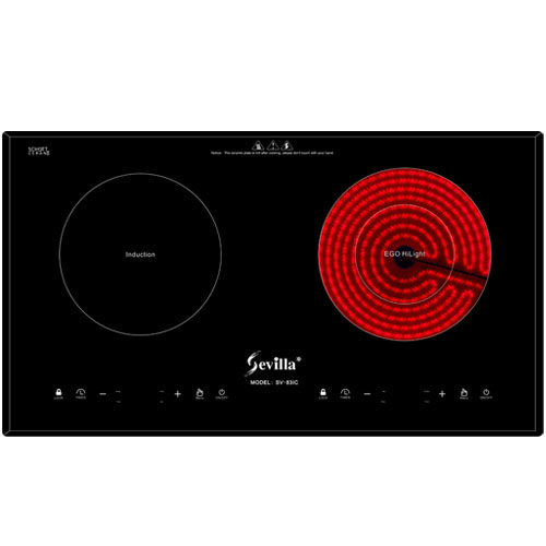 Bếp điện từ Sevilla SV-83IC kết hợp 1 vùng nấu hồng ngoại 2 vòng ngắt nhiệt sử dụng đĩa nhiệt EGO công nghệ Đức hiệu suất truyền nhiệt cao, tản nhiệt nhanh và vùng nấu từ sử dụng công nghệ induction zonneless tự động nhận biết kích thước nồi giảm hao hụt điện năng, tiết kiệm tối đa 17% điện năng so với các model bếp điện từ cùng loại. Mặt bếp được làm bằng loại kính chất liệu gốm sứ thủy tinh cao cấp hiệu SCHOTT CERANnhập khẩu liền nguyên khối từ Đức, sản xuất bởi tập đoàn SCHOTT với 130 năm kinh nghiệm trong lĩnh vực sản xuất kính, có khả năng chịu lực va đập, chịu nhiệt cao và kháng sốc nhiệt lên đến 750 độ C, thiết kế vát cạnh, màu đen, trơn bóng dễ lau chùi, mang lại không gian sang trọng cho phòng bếp.Thân bếp làm bằng thép không gỉ bảo vệ linh kiện điện bên trong giúp kéo dài tuổi thọ cho bếp, tạo nên vẻ đẹp khỏe khoắn cho thiết bị nấu.